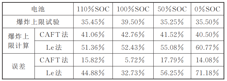 根據(jù)Le公式和CAFT公式,對(duì)不同SOC的電池?zé)崾Э禺a(chǎn)氣組分進(jìn)行爆炸極限計(jì)算與試驗(yàn)結(jié)果的對(duì)比,得表4和表5。