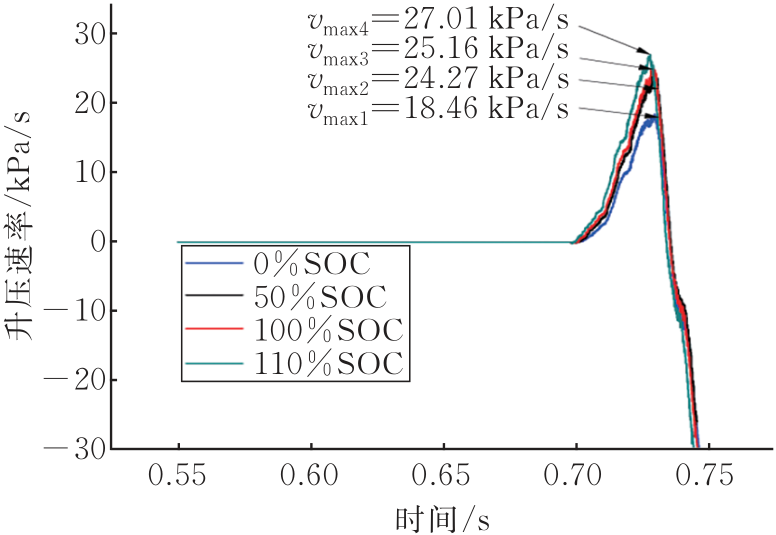 圖6為不同SOC最大壓力時(shí)的升壓速率曲線。從圖6可以看出,0%SOC、50%SOC、100%SOC、110%SOC的最大壓強(qiáng)上升速率分別為18.46、24.27、25.16、27.01 kPa/s,Kg分別為50.11、65.88、68.29和73.31。從Kg和壓強(qiáng)上升速率來(lái)看,隨著SOC的增大,磷酸鐵鋰電池?zé)崾Э貧怏w發(fā)生爆炸產(chǎn)生破壞的危害程度隨之增大。
