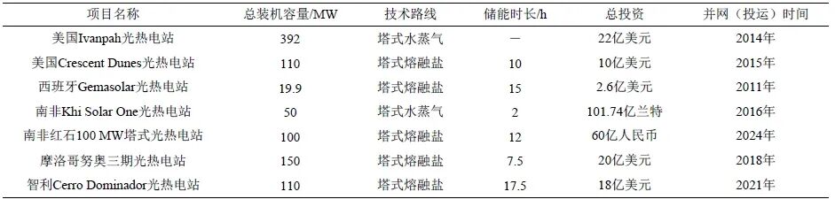 如上表所示,全球光熱發(fā)電領(lǐng)域的發(fā)展格局呈現(xiàn)出顯著的多元化特征,歐美、中東及非洲等地區(qū)成為其主要發(fā)展陣地。追溯歷史,塔式太陽(yáng)能熱發(fā)電技術(shù)的理論框架最早由蘇聯(lián)科學(xué)家提出,并于1950年成功設(shè)計(jì)實(shí)施了全球首座50千瓦規(guī)模的實(shí)驗(yàn)性塔式太陽(yáng)能熱發(fā)電裝置。隨后,法國(guó)在1976年實(shí)現(xiàn)了技術(shù)上的重要跨越,不僅建成并運(yùn)行了64千瓦的同類裝置,還同步完成了全球首座100千瓦功率的塔式太陽(yáng)能熱發(fā)電系統(tǒng)。1982年,美國(guó)成功建設(shè)了“Solar One”塔式太陽(yáng)能電站。1996年,基于“Solar One”的經(jīng)驗(yàn),建成了“Solar Two”塔式電站,并創(chuàng)新性地將傳熱介質(zhì)由水改為硝酸鹽。該電站配備了當(dāng)時(shí)最先進(jìn)的儲(chǔ)熱系統(tǒng),并成功運(yùn)行至1999年。其間,“Solar Two”首次應(yīng)用熔鹽技術(shù)并實(shí)現(xiàn)穩(wěn)定運(yùn)行,有力推動(dòng)了太陽(yáng)能塔式光熱電站的商業(yè)化進(jìn)程。進(jìn)入21世紀(jì),Ivanpah電站于2014年正式投入商業(yè)運(yùn)行,作為目前全球最大的塔式太陽(yáng)能電站,其總裝機(jī)容量高達(dá)392兆瓦,由美國(guó)Bright Source、Google及NRG公司聯(lián)合打造。2007年,西班牙設(shè)計(jì)建造了裝機(jī)容量為11兆瓦PS10塔式光熱電站,該電站是歐洲首座商業(yè)化塔式電站。2013年,PS20太陽(yáng)能塔式電站在PSl0電站的基礎(chǔ)上建造完成。近年來,拉丁美洲也迎來了光熱發(fā)電領(lǐng)域的突破性進(jìn)展,2021年,智利北部阿塔卡馬沙漠的Cerro Dominador塔式光熱發(fā)電站成功并網(wǎng),成為該地區(qū)首個(gè)光熱發(fā)電項(xiàng)目,總投資額高達(dá)10億美元。