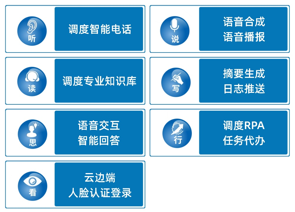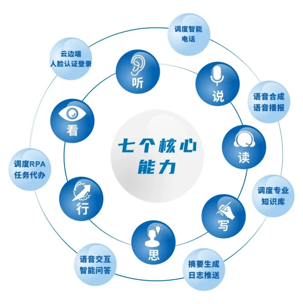 “智能終端”具備“聽、說、讀、寫、思、行、看”七大能力,覆蓋“電話轉(zhuǎn)寫、電話通話、電話摘要、代辦管理、人臉登錄、日志生成、交互問答、RPA任務(wù)”八大調(diào)度場景,全面解決傳統(tǒng)調(diào)度痛點。