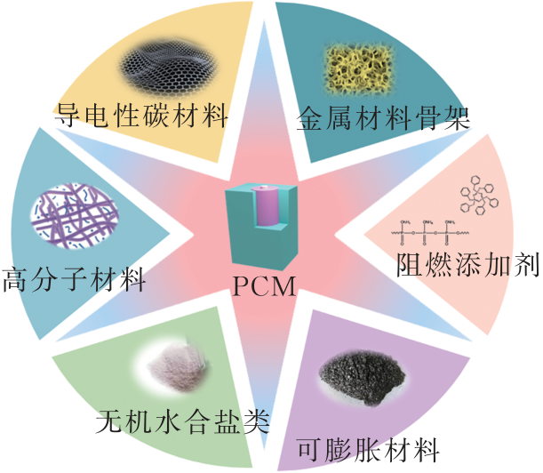 由于石墨烯等碳材料在微觀結(jié)構(gòu)上具有超強(qiáng)的平面熱導(dǎo)率,可達(dá)到2 000~5 000 W/(m.K),因此,向純相變材料中添加石墨烯、碳納米管等導(dǎo)電性碳材料的復(fù)合相變材料,導(dǎo)熱性提高了2個(gè)數(shù)量級(jí),其原有的相變潛熱性能也沒(méi)有受到損失,添加金屬翅片、金屬多孔材料、金屬納米粒子也可以起到相同的作用。然而導(dǎo)熱性能的提升并沒(méi)有增大材料的相變潛熱,降低火災(zāi)危險(xiǎn)性,因此,導(dǎo)熱增強(qiáng)型復(fù)合材料大多應(yīng)用于電池充放電過(guò)程中的熱管理。針對(duì)相變材料的易泄漏、易燃等局限性,將相變材料與阻燃涂層或柔性材料結(jié)合可以很好地解決這一問(wèn)題。MEI J等對(duì)比了針刺與加熱方式對(duì)電池?zé)崾Э赜|發(fā)的影響,將六苯氧基環(huán)三磷腈(HPCP)添加在石蠟相變材料中,HPCP分子中的苯氧基團(tuán)在高溫條件下解離,并發(fā)生歧化反應(yīng),產(chǎn)生的苯氧基及其歧化產(chǎn)物具有淬滅效應(yīng),通過(guò)氣相阻燃有效降低電池?zé)崾Э氐幕鹧娓叨群突鹧鏈囟?。LIU Q等以石蠟為相變材料基體,采用硫化橡膠將阻燃涂層粘附在相變材料表面,并采用聚磷酸銨作為氣相阻燃材料,電池發(fā)生熱失控時(shí),改性石蠟會(huì)膨脹吸收大量熱量并產(chǎn)生蓬松的炭層,聚磷酸銨持續(xù)熱解產(chǎn)生的焦磷酸和聚偏磷酸沉積在炭層中,進(jìn)一步隔絕氧氣,在抑制電池?zé)崾Э財(cái)U(kuò)散的同時(shí)解決了相變材料易泄漏流動(dòng)和易燃的問(wèn)題。