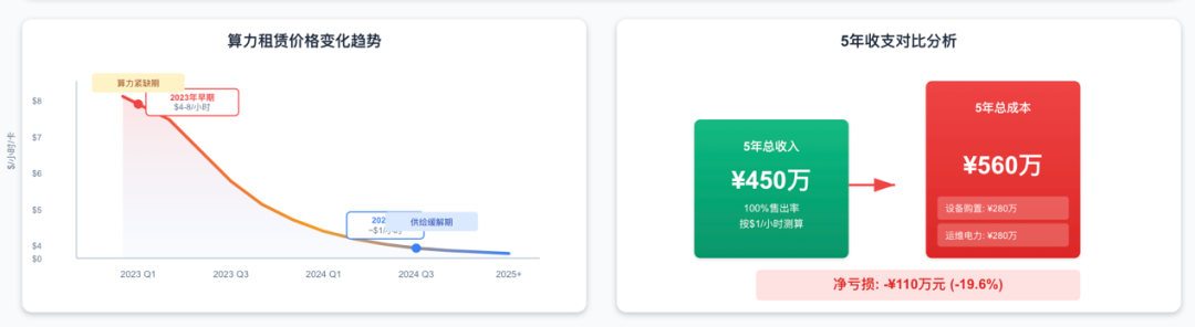 然而隨著2024年供給緩解、算力租賃價格下滑,中期租價降至每卡僅1美元/小時左右,按100%售出率測算5年總收入約¥450萬,扣除設(shè)備與機(jī)房等成本(約¥560萬,含服務(wù)器購置和5年運(yùn)維電力等附加成本,五年反而虧損約¥110萬。直線折舊法下前兩年盈利、第三年開始虧損的現(xiàn)象表明:GPU資產(chǎn)的經(jīng)濟(jì)壽命通常小于賬面折舊年限。