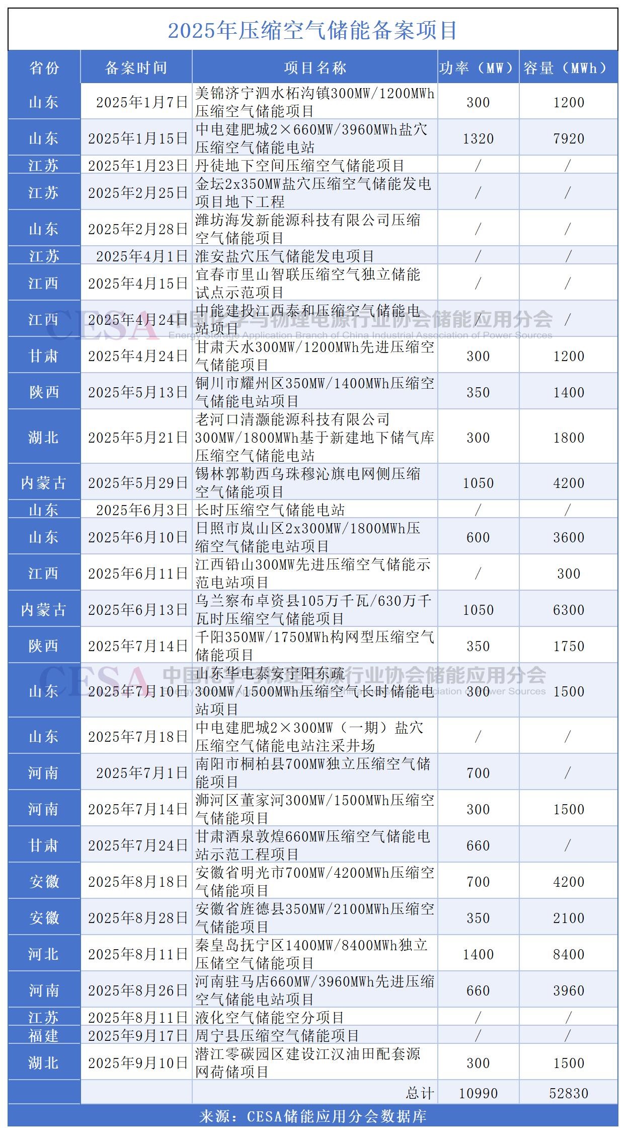 備案項(xiàng)目中,大容量壓縮空氣儲(chǔ)能項(xiàng)目有:中電建肥城2×660MW/3960MWh鹽穴壓縮空氣儲(chǔ)能電站、錫林郭勒西烏珠穆沁旗1050MW/4200MWh電網(wǎng)側(cè)壓縮空氣儲(chǔ)能項(xiàng)目、日照市嵐山區(qū)2x300MW/1800MWh壓縮空氣儲(chǔ)能電站項(xiàng)目、烏蘭察布卓資縣1050MW/6300MWh壓縮空氣儲(chǔ)能項(xiàng)目、安徽省明光市700MW/4200MWh壓縮空氣儲(chǔ)能項(xiàng)目、安徽省旌德縣350MW/2100MWh壓縮空氣儲(chǔ)能項(xiàng)目、秦皇島撫寧區(qū)1400MW/8400MWh獨(dú)立壓儲(chǔ)空氣儲(chǔ)能項(xiàng)目、河南駐馬店660MW/3960MWh先進(jìn)壓縮空氣儲(chǔ)能電站項(xiàng)目。
