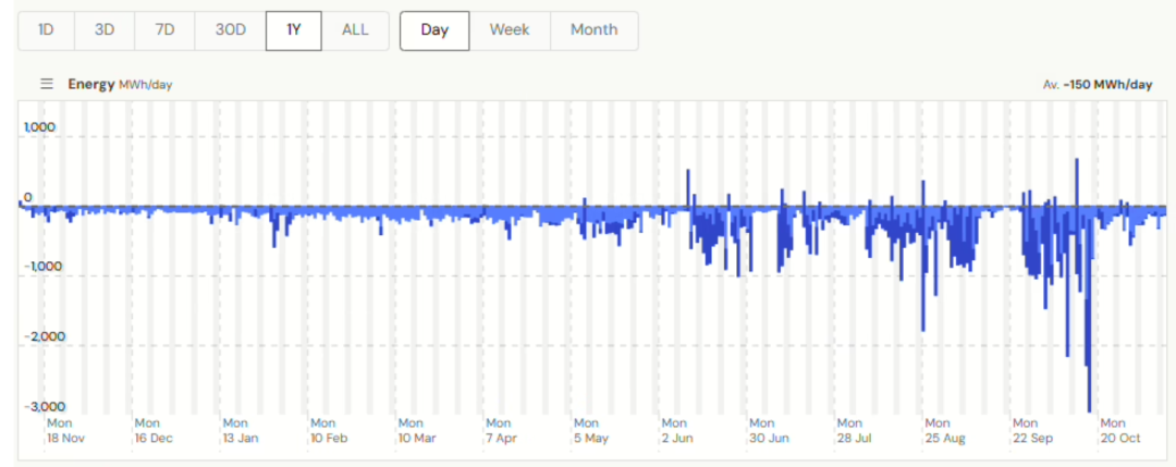 當(dāng)前運(yùn)行:10 月中旬完成滿出力測(cè)試后,站點(diǎn)能量活動(dòng)明顯回落;10 月 10 日實(shí)現(xiàn)首次整站完全放電,10 月 17 日充放電合計(jì)峰值 2,774 MWh。目前以約 350 MW 規(guī)模部分運(yùn)行(推測(cè)依賴剩余完好的主變)。