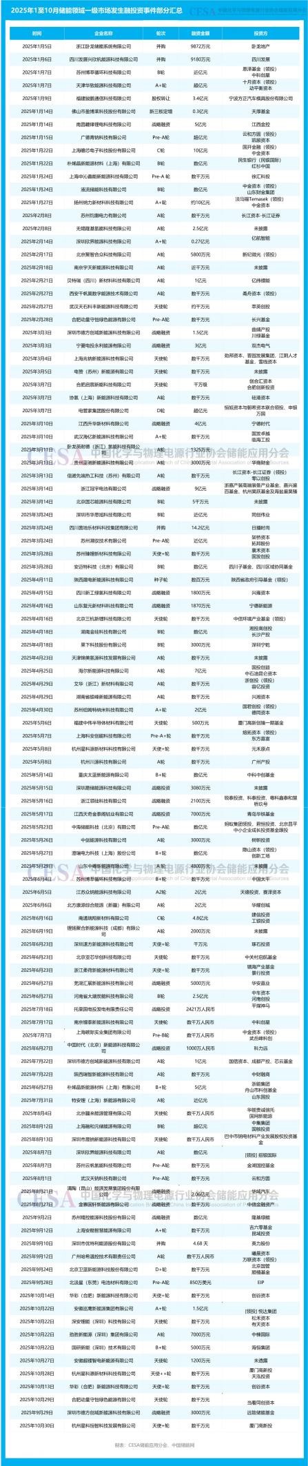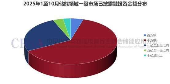 據(jù)CESA儲能應用分會數(shù)據(jù)庫不完全統(tǒng)計,2025年前三季度,國內新型儲能新增裝機總規(guī)模為31.77GW/85.11GWh,同比增長19.3%(功率)/28.41%(容量)。面對如此龐大的市場規(guī)模,對金融支持的需求也日益迫切。具體到融資情況來看,2025年1至10月儲能領域一級市場發(fā)生融投資事件283起,其中未披露具體融資金額的176起。在已披露金額的107起融投資事件中,百萬級融資5起,占比4.67%;千萬級融資67起,占比62.61%;1-5億元級融資28起,占比26.16%;5-10億元級融資4起,占比3.73%;10億元以上融資3起,占比2.8%。