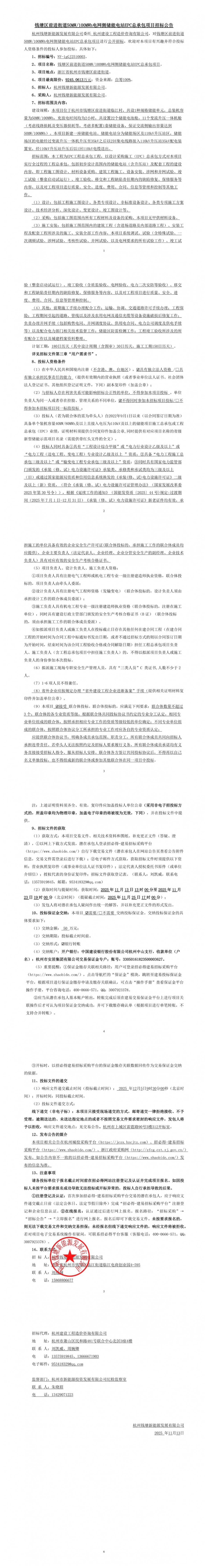中國儲能網(wǎng)訊:11月13日,錢塘區(qū)前進街道50MW/100MWh電網(wǎng)側(cè)儲能電站EPC總承包項目招標公告發(fā)布。