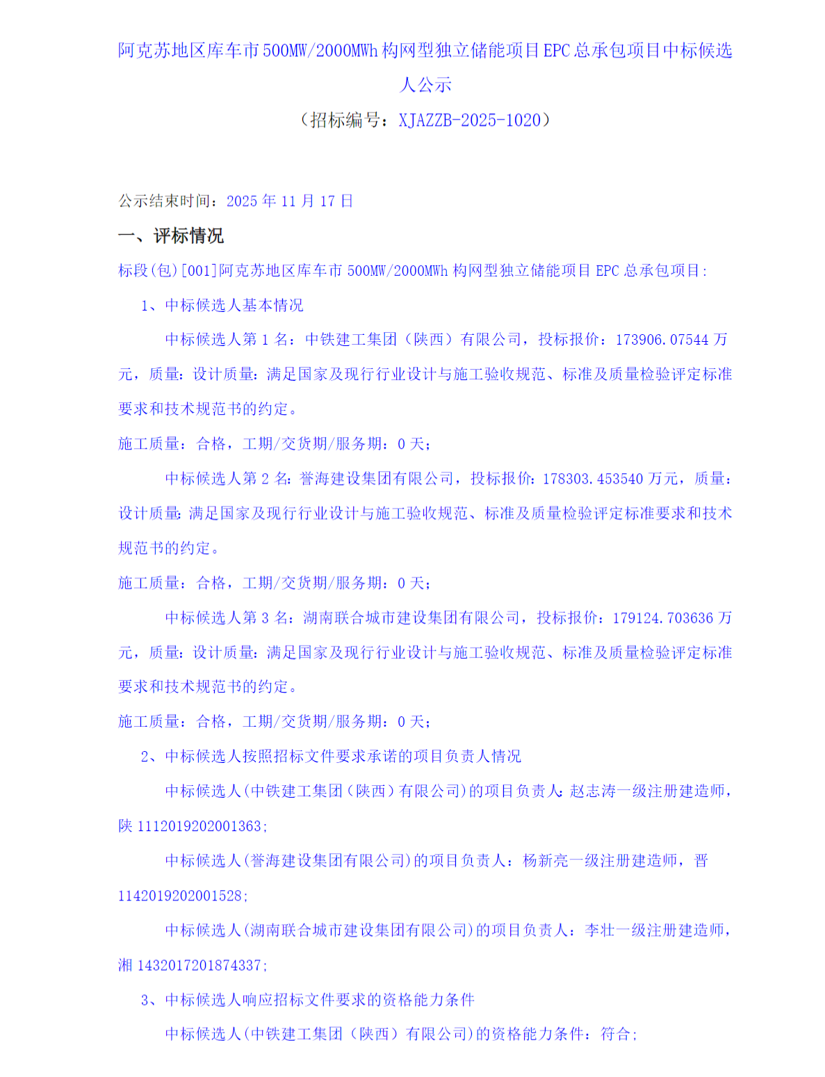 第一中標候選人為中鐵建工集團(陜西)有限公司,投標報價為173906.08萬元,折合單價為0.8695元/Wh;第二中標候選人為譽海建設(shè)集團有限公司,投標報價為178303.45萬元,折合單價為0.8915元/Wh;第三中標候選人為湖南聯(lián)合城市建設(shè)集團有限公司,投標報價為179124.7萬元,折合單價為0.8956元/Wh。