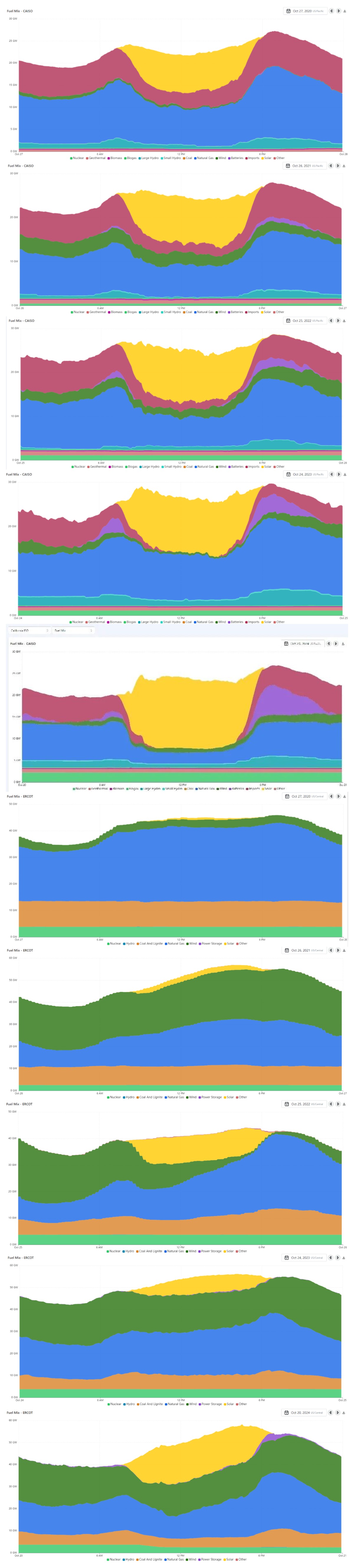 圖2:CAISO與ERCOT2020—2024年10月份倒數(shù)第二個周二的發(fā)電出力組合(不含電池儲能充電負荷)