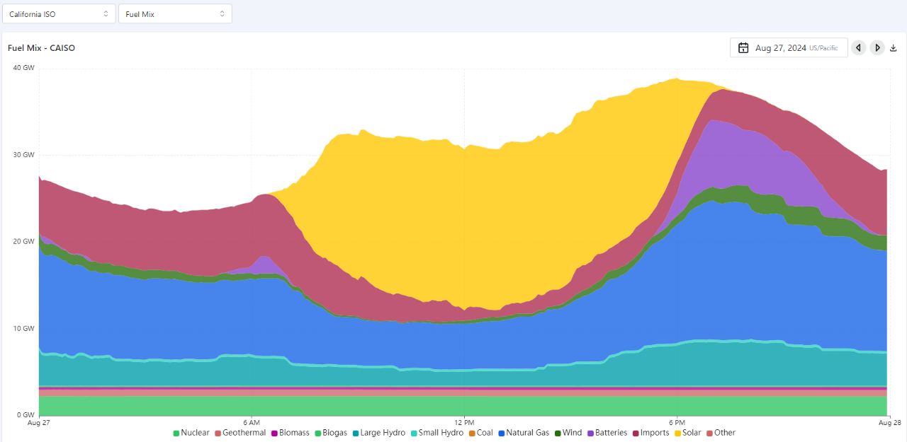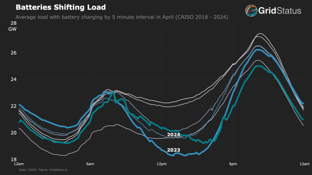 隨著近兩年加州電池儲能設(shè)施的大量部署與應(yīng)用,疊加電池充電負荷后的CAISO典型時段的平均負荷曲線出現(xiàn)了范式上的轉(zhuǎn)變,2024年的“鴨子”相比2023年變瘦了。這一現(xiàn)象的出現(xiàn)意味著午間電池充電負荷對系統(tǒng)的影響已經(jīng)超越了光伏發(fā)電的影響,其他類型靈活性資源面臨的運行壓力開始下降。