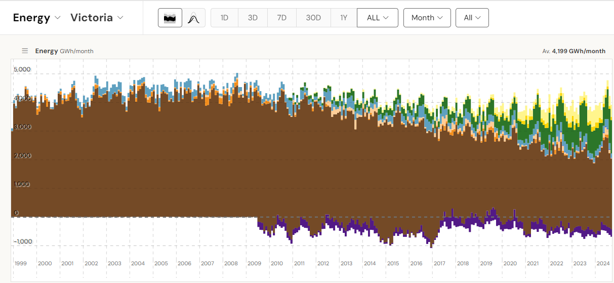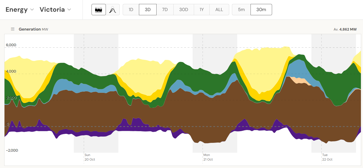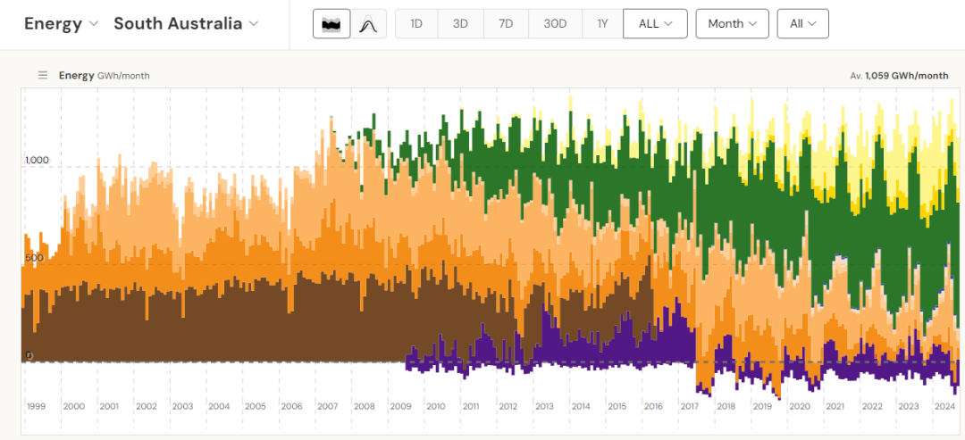 澳大利亞各州發(fā)電出力組合差異較大,其中南澳州已實現(xiàn)極高比例的風(fēng)光發(fā)電出力組合供電,風(fēng)光不可用時的靈活性需求則由聯(lián)絡(luò)線以及多種燃氣機組滿足。與南澳州相鄰的維多利亞州則仍然保留了較高比例的褐煤發(fā)電機組,系統(tǒng)所需的剩余靈活性則來自聯(lián)絡(luò)線、水電、小比例天然氣機組的組合。