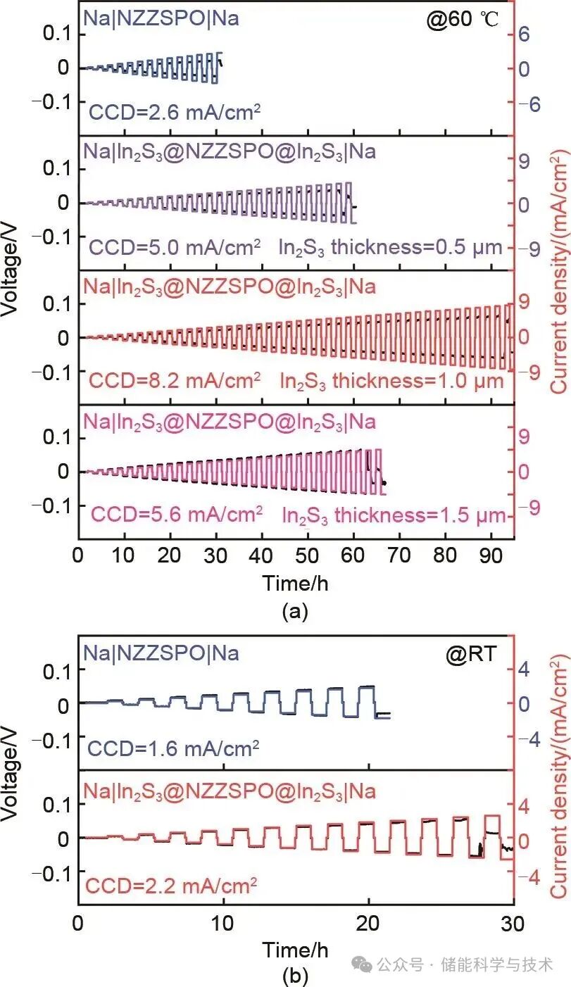 將鈉箔貼附在NZZSPO和NZZSPO@In2S3固體電解質(zhì)的兩側(cè),并在50 MPa的等靜壓下壓制得到對(duì)稱電池。為了測量臨界電流密度(CCD),這些電池在LAND CT-2001A電池測試系統(tǒng)上以逐步增加的電流密度進(jìn)行循環(huán)測試。通過對(duì)稱電池在不同溫度和電流密度下的恒流充放電循環(huán),評(píng)估其長循環(huán)穩(wěn)定性。