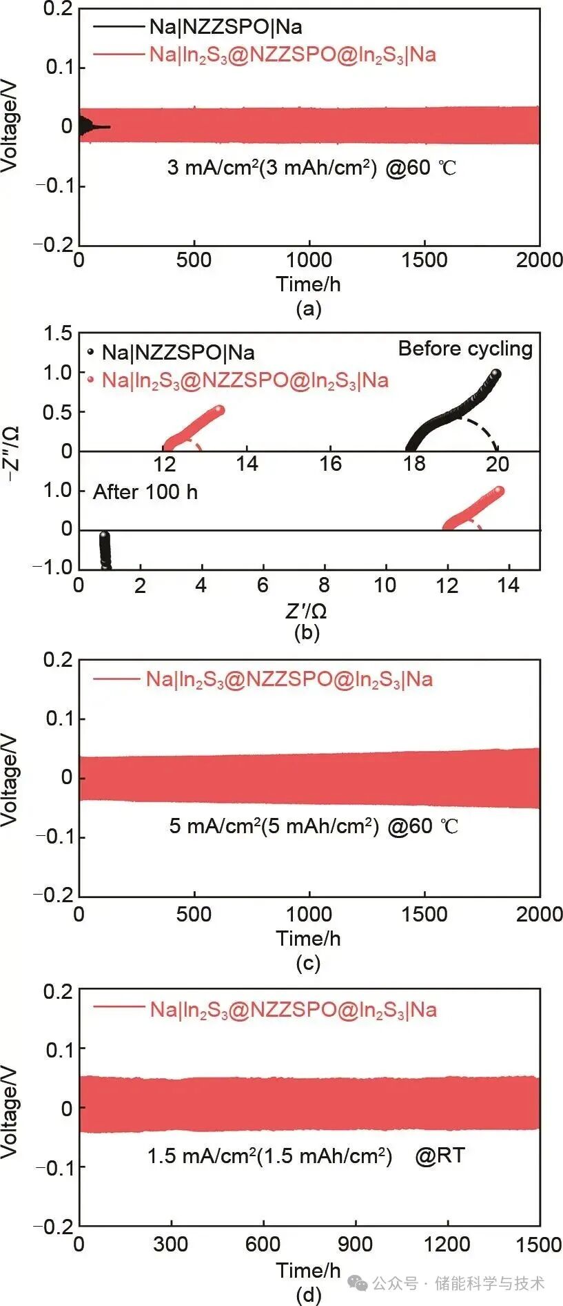 圖5 (a) Na|NZZSPO|Na和Na|In2S3@NZZSPO@In2S3 |Na對(duì)稱電池在60 ℃、3 mA/cm2下的恒流循環(huán)性能;(b) Na|NZZSPO|Na和Na|In2S3@NZZSPO@In2S3|Na對(duì)稱電池在60 ℃下循環(huán)100小時(shí)前后的阻抗譜圖;Na|In2S3 @NZZSPO@In2S3|Na對(duì)稱電池在 (c) 60 ℃、5 mA/cm2和 (d) 室溫、1.5 mA/cm2下的恒流循環(huán)性能