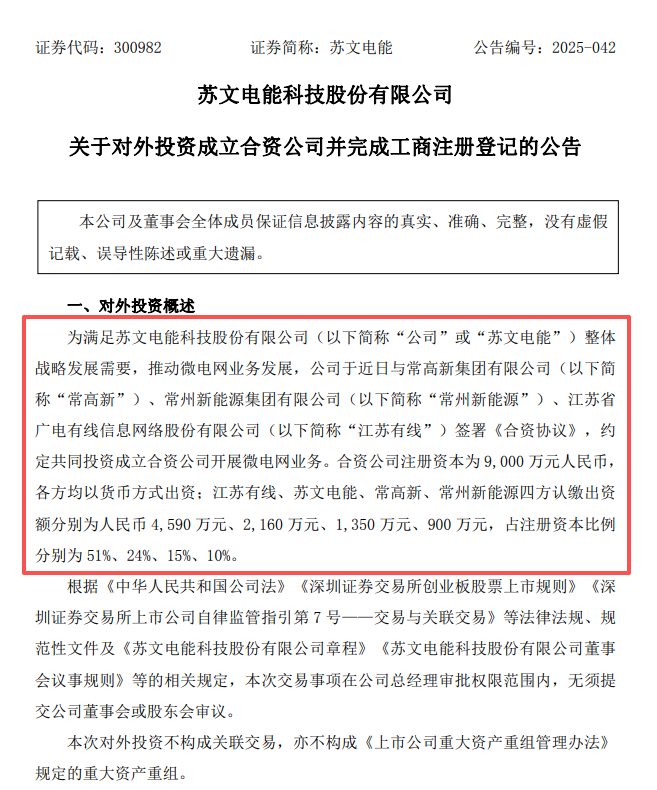 中國儲(chǔ)能網(wǎng)訊:2025年11月17日,蘇文電能科技股份有限公司發(fā)布公告稱,公司近日與常高新集團(tuán)有限公司、常州新能源集團(tuán)有限公司、江蘇省廣電有線信息網(wǎng)絡(luò)股份有限公司簽署《合資協(xié)議》,共同投資成立江蘇視界新能源產(chǎn)業(yè)發(fā)展有限公司,專注開展微電網(wǎng)業(yè)務(wù),目前該合資公司已完成工商注冊登記。合資公司注冊資本為9000萬元人民幣。其中,江蘇有線認(rèn)繳出資4590萬元,占注冊資本的51%;蘇文電能認(rèn)繳出資2160萬元,持股比例24%;常高新認(rèn)繳1350萬元,持股15%;常州新能源認(rèn)繳900萬元,持股10%。