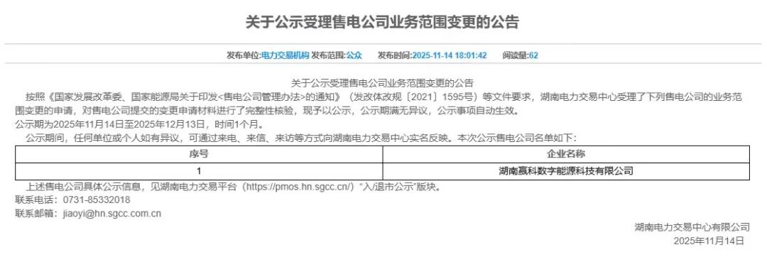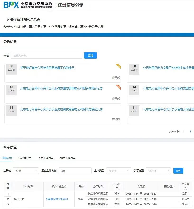 中國(guó)儲(chǔ)能網(wǎng)訊:根據(jù)北京電力交易中心最新公示信息,贏科數(shù)能(湖南贏科數(shù)字能源科技有限公司)已完成在四川、安徽兩省的業(yè)務(wù)范圍變更申請(qǐng),具備兩省的售電資質(zhì)。