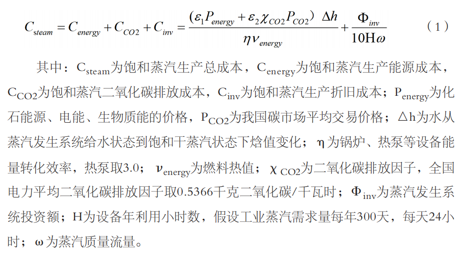 根據(jù)我國城市供熱價格管理相關(guān)規(guī)定,供熱成本是指供熱過程中發(fā)生的燃料費(fèi)、電費(fèi)、水費(fèi)、資產(chǎn)折舊費(fèi)、修理費(fèi)、工資以及其他應(yīng)計入供熱成本的直接費(fèi)用。由于本文側(cè)重分析不同技術(shù)路徑之間的成本對比,為簡化分析,供熱成本計算時只考慮涉及能源成本和投資強(qiáng)度的成本項。同時,考慮到不同能源碳排放強(qiáng)度不同,碳排放成本作為蒸汽成本之一。