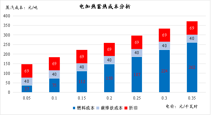 對于電加熱蓄熱系統(tǒng)而言,由于系統(tǒng)初始投資較大,折舊成本達(dá)到69元/噸,相當(dāng)于0.09元/千瓦時的能源成本,在蒸汽成本構(gòu)成中占比較高。在碳排放成本方面,采用全國電力平均二氧化碳排放因子,對于每噸蒸汽而言,對應(yīng)的碳排放量為0.4噸二氧化碳,分別是燃煤和燃?xì)獾?.6倍、2.7倍,可見在目前全國電力平均二氧化碳排放強(qiáng)度下,采用電加熱蓄熱方式蒸汽的碳排放強(qiáng)度顯著高于燃煤和燃?xì)?,只有?dāng)電力二氧化碳排放強(qiáng)度降低到0.2千克/千瓦時以下時(即電網(wǎng)碳排放因子再降低63%以上時),電供熱碳排放強(qiáng)度才與天然氣供熱碳排放強(qiáng)度相當(dāng)。