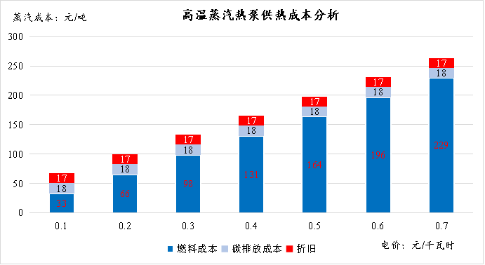 對于高溫蒸汽熱泵系統(tǒng)供工業(yè)蒸汽而言,由于熱泵電熱性能系數(shù)較高,生產(chǎn)單位蒸汽耗電量約等于電鍋爐耗電量/COP,相應(yīng)地,蒸汽的直接能源成本和碳排放成本都顯著下降,在相同電價水平下,蒸汽熱泵系統(tǒng)均具有更好的經(jīng)濟(jì)性。
