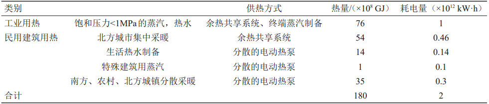 表2給出了2060年零碳情境下各類熱量需求的零碳制備方案(不含工業(yè)生產(chǎn)所需的6×109 GJ高參數(shù)蒸汽)。通過(guò)分散的熱泵、集中的余熱共享系統(tǒng),可以依靠低溫?zé)嵩赐ㄟ^(guò)電力制備工業(yè)生產(chǎn)和建筑運(yùn)行所需的1.8×1010GJ熱量,合計(jì)消耗電力2×1012 kW·h,約占未來(lái)我國(guó)電力總量的12%。
