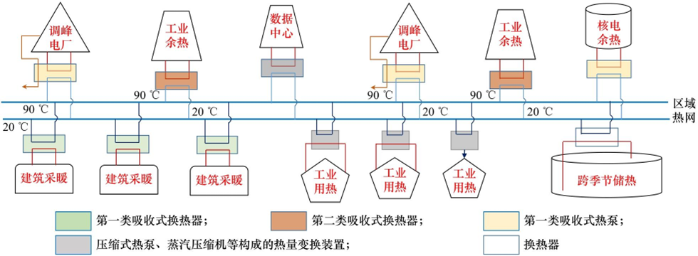 由統(tǒng)一的熱量輸配管網(wǎng)匯集各類余熱熱源的熱量,而各類余熱熱源產(chǎn)出熱量的溫度不盡相同,需要通過(guò)熱量變換裝置將熱源輸出的溫度變換到統(tǒng)一的參數(shù)。各類用熱用戶的狀況不同,返回到輸熱循環(huán)管網(wǎng)的回水溫度也不同,需要采用熱量變換裝置進(jìn)行參數(shù)變換,使各類用熱用戶返回到主管網(wǎng)回水的溫度保持統(tǒng)一。熱量變換裝置的作用類似電力輸配系統(tǒng)中的變壓器(解決源、網(wǎng)、荷對(duì)電壓的不同需求),支持熱量在不同溫度、不同狀態(tài)之間的有效傳遞。