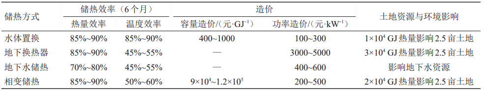 近年來(lái),大規(guī)模儲(chǔ)熱是國(guó)際性研究熱點(diǎn)。儲(chǔ)熱可促進(jìn)供熱和供冷的用電需求與可再生能源發(fā)電之間的匹配性,有助于平衡電力季節(jié)性供需,支持向以可再生能源為主的能源系統(tǒng)的轉(zhuǎn)變。國(guó)內(nèi)外提出并實(shí)踐了多種跨季節(jié)儲(chǔ)熱技術(shù)路線??缂竟?jié)儲(chǔ)熱的方式主要有水體置換、地下?lián)Q熱器、地下水儲(chǔ)熱、相變儲(chǔ)熱,各種儲(chǔ)熱方式熱量效率差別不大,但溫度效率差別很大(見表3)。從熱量效率、溫度效率、造價(jià)、占地四方面綜合對(duì)比,水體置換儲(chǔ)熱在大多數(shù)場(chǎng)合都是優(yōu)選方式,也是迄今為止技術(shù)最成熟、應(yīng)用最廣泛的儲(chǔ)熱方式。