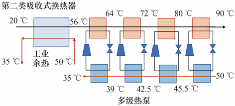 熱量變換器的熱量輸入源為循環(huán)水,如果熱量輸出側(cè)也是循環(huán)水,當(dāng)熱源側(cè)循環(huán)水的平均溫度高于熱匯側(cè)循環(huán)水平均溫度時(shí),可以通過(guò)吸收式換熱器實(shí)現(xiàn)這一換熱過(guò)程。在熱源與熱匯溫差明顯不匹配時(shí),吸收式換熱器可以使熱匯側(cè)獲得最高溫度,在滿足經(jīng)濟(jì)性的前提下實(shí)現(xiàn)兩側(cè)平均溫度差低至10 K條件時(shí)的熱量傳遞。當(dāng)兩側(cè)平均溫度差<10 K甚至熱匯側(cè)要求的平均溫度高于熱源側(cè)時(shí),需輔以壓縮式熱泵并輸入電力做功以提高熱匯側(cè)的溫度品位。從50/35 ℃的余熱中提取熱量到90/20 ℃的余熱共享循環(huán)水系統(tǒng)中的流程如圖2所示。