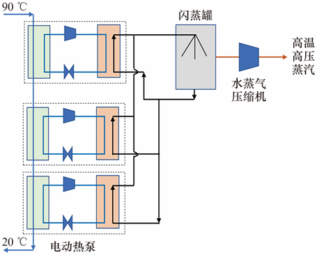 在多數(shù)情景下,工業(yè)生產(chǎn)需要的熱量以蒸汽形式提供,可從90/20 ℃的循環(huán)水中提熱量,通過(guò)吸收式換熱器、電動(dòng)熱泵聯(lián)合工作將熱量變換成為高溫水,再通過(guò)閃蒸得到低壓蒸汽,經(jīng)過(guò)水蒸氣壓縮機(jī)將低壓蒸汽壓縮至所需壓力(見圖3)。按照水蒸氣的焓與凝結(jié)水焓值之差計(jì)算蒸汽的熱量,蒸汽的熱量與耗電量之比(等效COP)為3。合理配置多級(jí)吸收式換熱、壓縮熱泵的比例,通過(guò)多級(jí)閃蒸和多級(jí)蒸汽壓縮,可進(jìn)一步減少各級(jí)換熱過(guò)程的耗散、不同溫度之間摻混的耗散,提高等效COP。