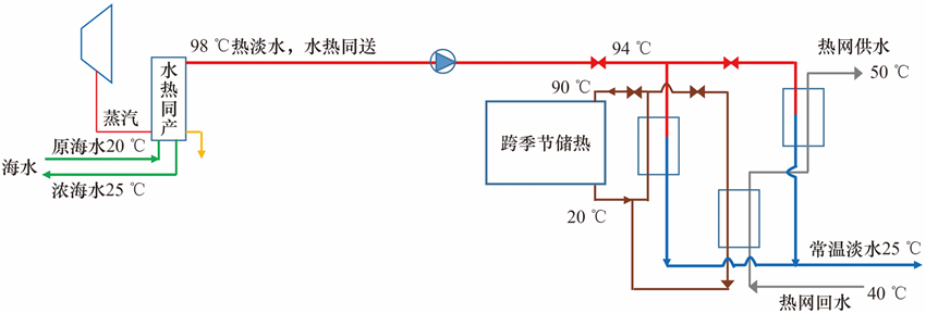 抽取核電低壓蒸汽作為海水淡化的動(dòng)力,通過(guò)多級(jí)閃蒸方式制備95 ℃的熱淡水。輸入蒸汽熱量的10%~15%隨海水淡化后得到的濃海水排出,85%~90%的熱量進(jìn)入熱淡水。當(dāng)取出的原海水溫度為20 ℃、輸出的熱淡水溫度為95 ℃時(shí),提供1 t蒸汽只需要制備熱淡水6.8~7.2 t,遠(yuǎn)低于常規(guī)熱法海水淡化的制水比(12~16)。熱法海水淡化裝置相對(duì)簡(jiǎn)單,允許有較大的換熱溫差,可降低海水淡化裝備的投資。在非采暖季,熱淡水送至用熱用水末端,與跨季節(jié)儲(chǔ)熱設(shè)施的循環(huán)水換熱,得到常溫淡水用于生活給水;換熱釋放出的熱量進(jìn)入跨季節(jié)儲(chǔ)熱設(shè)施。在采暖季,熱淡水直接與城市熱網(wǎng)循環(huán)水換熱,冷卻至常溫后進(jìn)入生活用水;進(jìn)入寒冷期,增大熱網(wǎng)循環(huán)水流量,部分循環(huán)水與跨季節(jié)儲(chǔ)熱設(shè)施的循環(huán)水換熱,為供暖提供更多的熱量。