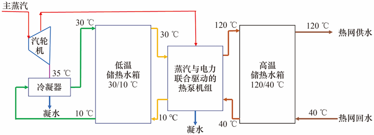 對(duì)于沒(méi)有供熱需求的非采暖期,這種熱電協(xié)同方式不成立。然而,如果有跨季節(jié)儲(chǔ)熱設(shè)施,則可取消高溫儲(chǔ)熱水箱,換用大規(guī)??缂竟?jié)儲(chǔ)熱設(shè)施接收電力低谷期制備的高溫?zé)崴?。?jù)此,燃煤電廠全年任何時(shí)間都可以根據(jù)電力系統(tǒng)調(diào)峰的需要運(yùn)行,回收全部冷端排熱量,隨時(shí)為建筑和工業(yè)生產(chǎn)提供所需求的熱量。