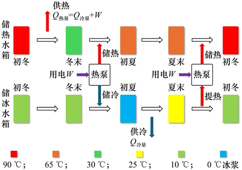 跨季節(jié)儲(chǔ)熱/儲(chǔ)冷原理討論如下。進(jìn)入冬季,利用蓄熱水箱預(yù)先儲(chǔ)存的90 ℃熱水為建筑供熱,釋放出熱量后成為30 ℃溫水并儲(chǔ)存;采暖結(jié)束后,利用春季的過(guò)剩電力將儲(chǔ)冷水箱中15 ℃的冷水制成冰漿,用制冰提取出的熱量加熱蓄熱水箱中的溫水。春季結(jié)束時(shí),儲(chǔ)冷水箱中為含冰量30%~50%的冰漿,儲(chǔ)熱水箱的水溫升至65 ℃。進(jìn)入夏季,利用儲(chǔ)冷水箱中的冰漿為建筑供冷,釋出冷量后成為25 ℃的溫水。進(jìn)入秋季,再利用富余的電力通過(guò)熱泵將冷水箱中25 ℃的溫水冷卻到10 ℃,提取出的熱量將熱水箱中的熱水由65 ℃升溫至90 ℃。由此實(shí)現(xiàn)利用春、秋季的富余電力,將夏季建筑物排出的熱量用于冬季采暖,既可減少冬、夏季采暖空調(diào)的用電量,也能解決冬季建筑采暖缺少熱源的問(wèn)題。通過(guò)這一方式全年獲取的冷/熱量之和與用電總量之比可達(dá)5,即使考慮儲(chǔ)熱、儲(chǔ)冷損失,綜合COP>4,優(yōu)于單獨(dú)的熱泵制熱、制冷表現(xiàn)。