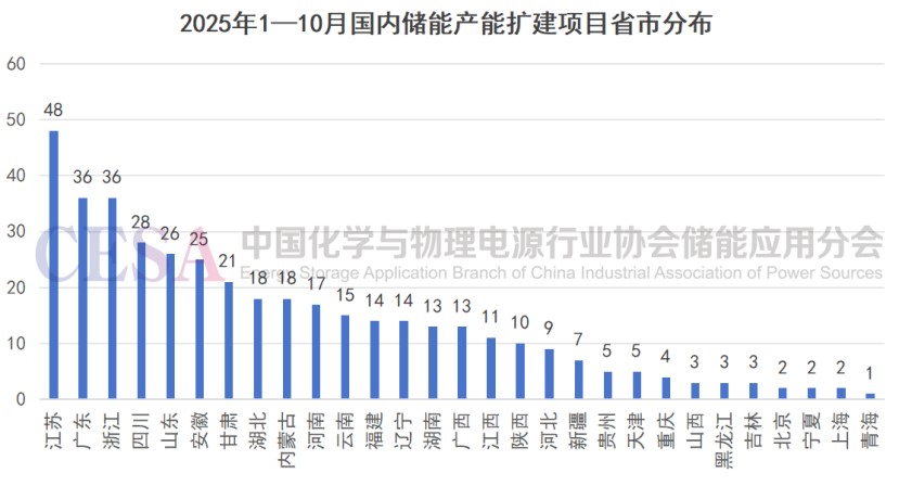 如果將視角下沉到省級層面,江蘇省以48個項目遙遙領(lǐng)先全國,蘇州、無錫等制造業(yè)重鎮(zhèn)無疑是其項目的主要承載地。廣東和浙江則以36個項目并列第二。廣東的項目多集中在深圳、惠州等珠三角城市,重點在于鋰電池產(chǎn)業(yè)鏈的進(jìn)一步延伸;而浙江的項目則主要分布在杭州、寧波,充分依托其活躍的民營經(jīng)濟(jì)來推動儲能技術(shù)的商業(yè)化應(yīng)用。