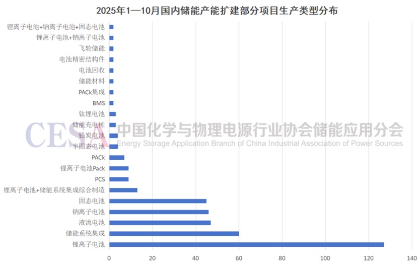 在擴(kuò)建項目的生產(chǎn)類型上,鋰離子電池?zé)o疑是絕對的主力,以127個項目高居榜首。這不難理解,畢竟它在動力電池、電網(wǎng)儲能以及消費電子等領(lǐng)域的成熟應(yīng)用和廣泛市場認(rèn)可,使其成為當(dāng)前儲能技術(shù)路線的絕對主導(dǎo)。