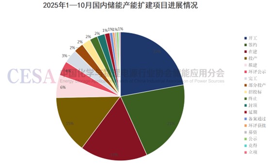 審視項目進(jìn)展,2025年1月至10月期間,國內(nèi)儲能產(chǎn)能擴(kuò)建項目展現(xiàn)出了非?;钴S的生命周期。先看前期籌備,光是簽約的項目就有86個,還有23個在規(guī)劃中、15個進(jìn)入環(huán)評公示,另外1個立項、1個競得地塊,這足以說明企業(yè)和地方都在積極攢資源、做布局。