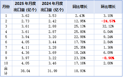 表一2025年1-10月鋰離子電池出口量月度變化情況