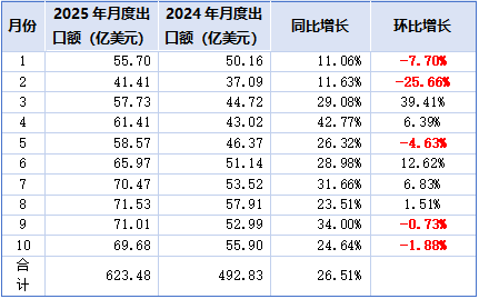 根據(jù)海關(guān)最新統(tǒng)計(jì)數(shù)據(jù),2025年1-10月鋰離子電池出口數(shù)量為38.04億個(gè),同比增長(zhǎng)18.93%;2025年1-10月我國(guó)鋰離子電池出口額為623.48億美元,同比增加26.51%,延續(xù)了穩(wěn)定增長(zhǎng)勢(shì)頭。其中,2025年10月份,出口額69.68億美元,同比增長(zhǎng)24.64%,10月份,出口數(shù)量為4.05億個(gè),同比增長(zhǎng)17.16%。