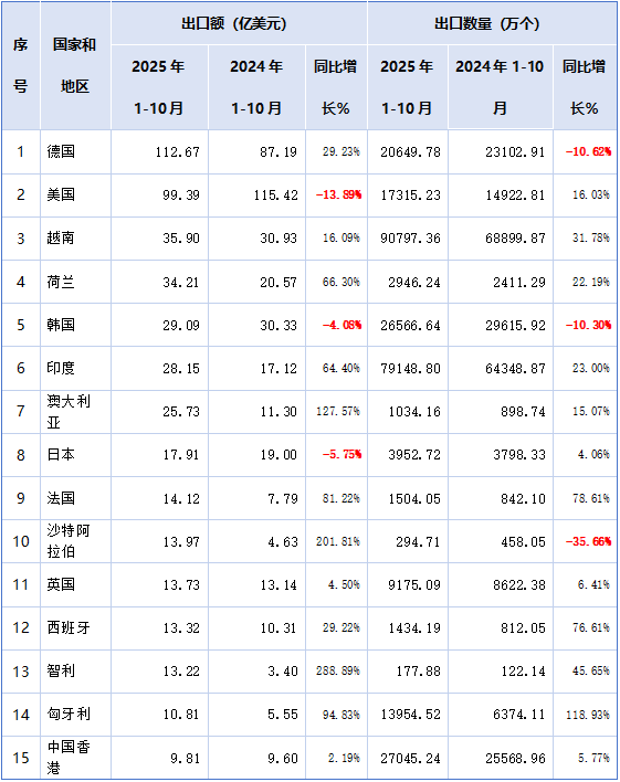 德國(guó)從5月份開(kāi)始已經(jīng)取代美國(guó)成為我國(guó)鋰離子電池第一大出口市場(chǎng),2025年1-10月出口金額為112.67億美元,同比增長(zhǎng)29.23%,占我國(guó)鋰離子出口總額的18.1%。第二大市場(chǎng)為美國(guó),1-10月出口總金額為99.39億美元,同比下降13.89%,占我國(guó)鋰離子電池出口額的15.9%。越南為第三大出口市場(chǎng),出口金額為35.9億美元,同比增長(zhǎng)16.09%,占我國(guó)鋰離子電池出口額的5.8%。前十大出口國(guó)家中,同比增幅最大的國(guó)家有智利、沙特阿拉伯、澳大利亞。