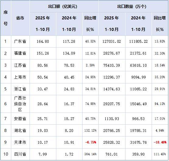 表四 2025年1-10月鋰離子電池出口額前10大省市變化情況