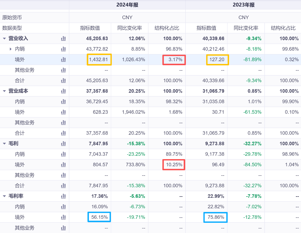 成果也直接反映在財(cái)報(bào)中:公司境外收入從2023年的127萬元躍升至2024年的1433萬元,毛利率更是分別高達(dá)75.86%、56.15%,顯著高于公司整體20%左右的水平。盡管2024年境外收入占比僅3.17%,卻貢獻(xiàn)了10.25%的毛利,成為盈利結(jié)構(gòu)優(yōu)化的關(guān)鍵推力。