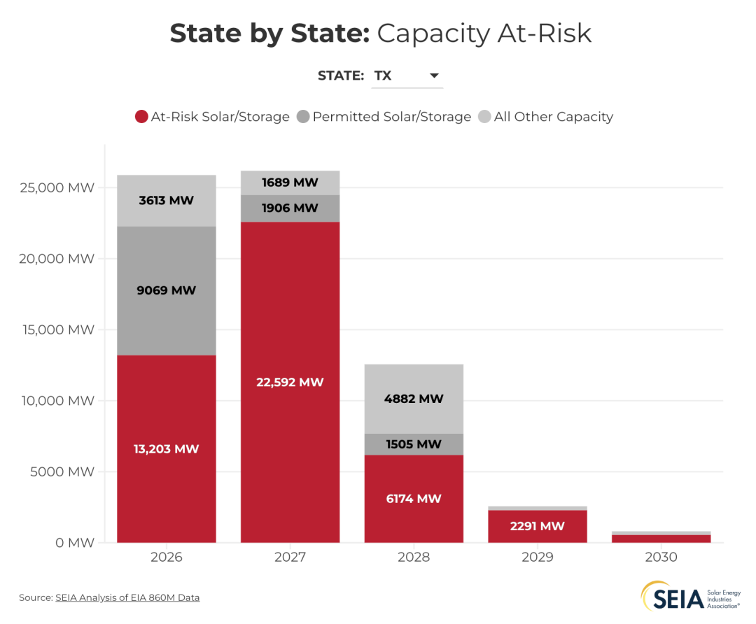 SEIA的分析顯示,德克薩斯州一州就占了全部高風(fēng)險(xiǎn)項(xiàng)目的近40%,與此同時(shí),德州的數(shù)據(jù)中心用電負(fù)荷也正快速上升,一旦新能源項(xiàng)目無法跟上,電力供應(yīng)缺口將被化石燃料補(bǔ)位。