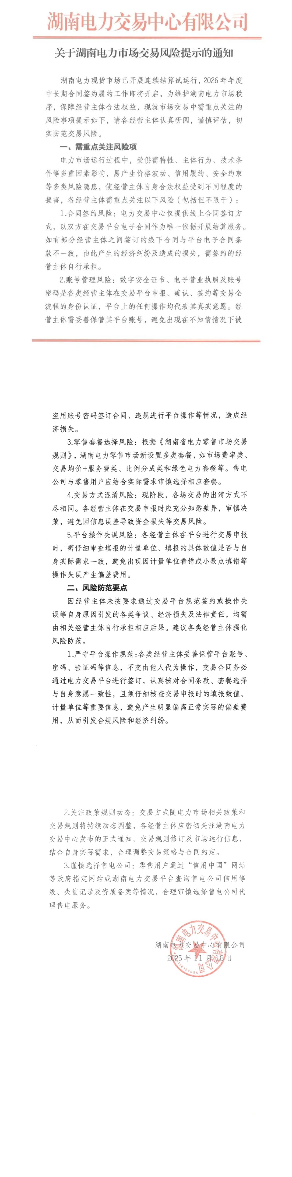 中國儲能網(wǎng)訊:湖南電力現(xiàn)貨市場已開展連續(xù)結(jié)算試運(yùn)行,2026年年度中長期合同簽約履約工作即將開啟,為維護(hù)湖南電力市場秩序,保障經(jīng)營主體合法權(quán)益,現(xiàn)就市場交易中需重點關(guān)注的風(fēng)險事項提示如下,請各經(jīng)菅主體認(rèn)真研閱,謹(jǐn)慎評估,切實防范交易風(fēng)險。