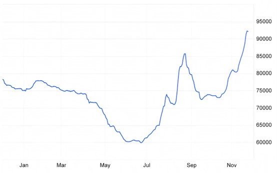 然而,2025年7月碳酸鋰價(jià)格開(kāi)始快速回彈,8月一度上漲超過(guò)8.5萬(wàn)元/噸,后回落至7.245萬(wàn)元/噸。進(jìn)入11月后,價(jià)格快速上漲,截至2025年11月24日,碳酸鋰均價(jià)已回升至9.215萬(wàn)元/噸,碳酸鋰期貨主力合約價(jià)格已突破10萬(wàn)元/噸,較6月最低點(diǎn)的5.85萬(wàn)元/噸漲幅超過(guò)70%。