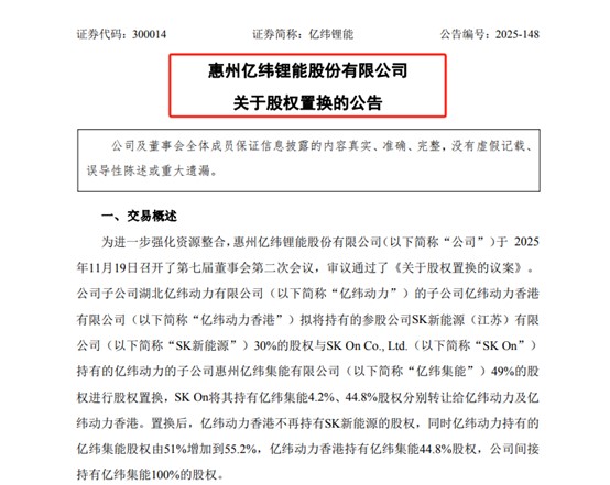 然而真正的棋局,遠(yuǎn)比產(chǎn)品層面的合縱連橫更為宏大。2025年11月20日,一紙股權(quán)置換公告將億緯鋰能與韓國(guó)電池巨頭SK On的“跨國(guó)聯(lián)姻”推向了尾聲。