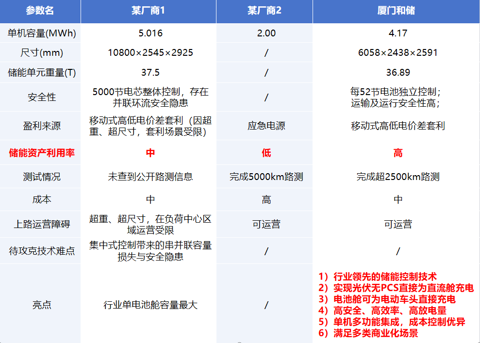 以下為廈門和儲移動儲能產(chǎn)品與同行主要產(chǎn)品的關(guān)鍵參數(shù)對比: