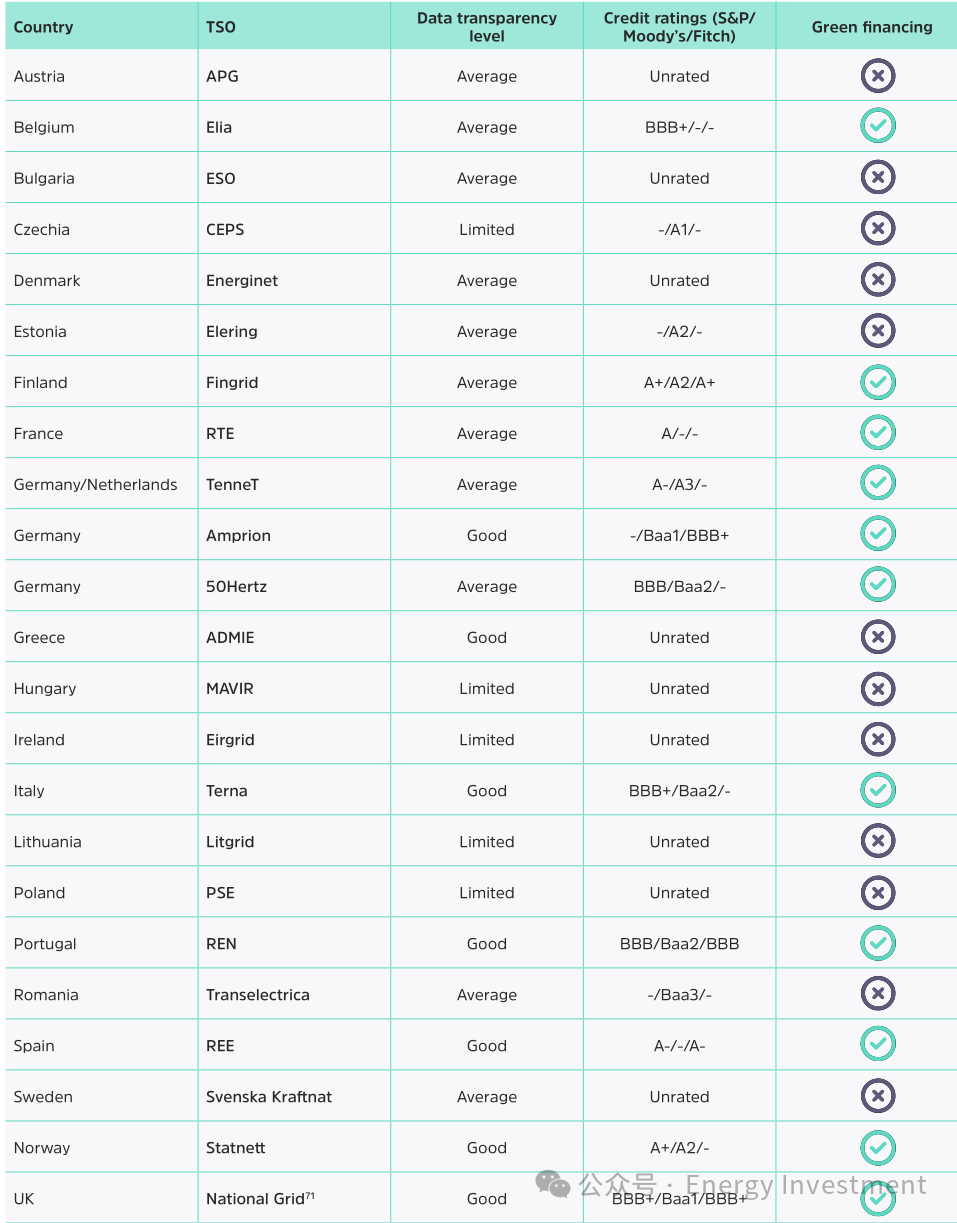 23家電力輸電系統(tǒng)運(yùn)營(yíng)商在數(shù)據(jù)披露和透明度方面顯示出廣泛的頻譜。一些,如National Grid、Statnett、Terna、REN和Elia以及50Hertz,在線清晰披露數(shù)據(jù)。然而,其他運(yùn)營(yíng)商在關(guān)鍵指標(biāo)(如計(jì)劃資本投資分解和監(jiān)管資產(chǎn)基礎(chǔ)(RAB))方面不輕易報(bào)告,這使評(píng)估公司財(cái)務(wù)定位和為能源轉(zhuǎn)型準(zhǔn)備的程度變得困難。