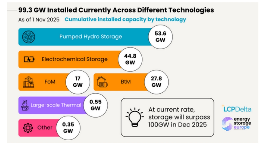 中國儲能網(wǎng)訊:根據(jù)LCP Delta和歐洲儲能協(xié)會(ESEA)最新分析,截至11月初,歐洲迄今為止累計部署的儲能系統(tǒng)裝機(jī)量有望達(dá)到100GW。