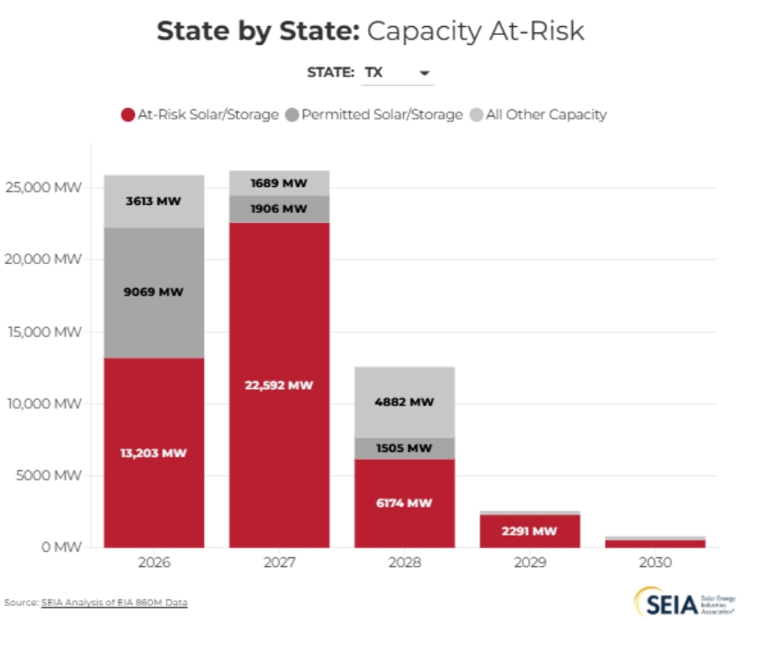 美國(guó)太陽能產(chǎn)業(yè)協(xié)會(huì)(SEIA)的分析對(duì)短期和中期影響進(jìn)行了量化。根據(jù)該協(xié)會(huì)預(yù)測(cè),到2026年,德克薩斯州規(guī)劃開發(fā)的13GW以上太陽能發(fā)電場(chǎng)及配套的電池儲(chǔ)能系統(tǒng)可能無法并網(wǎng),這占該州同期所有開發(fā)的清潔能源項(xiàng)目裝機(jī)量的一半。
