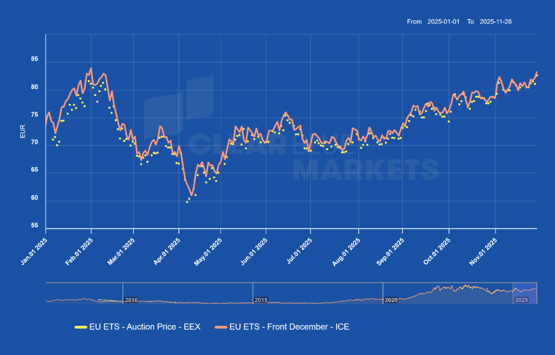 轉(zhuǎn)折點(diǎn)出現(xiàn)在夏末。隨著貿(mào)易戰(zhàn)的恐慌情緒逐漸被市場消化,碳價(jià)在第三季度觸底反彈。這一輪上漲的動力主要來自兩個方面:一是合規(guī)實(shí)體的履約購買需求;二是投資基金開始押注2026年的結(jié)構(gòu)性短缺,大舉建立多頭頭寸。特別是在9月和10月,隨著天然氣價(jià)格回落帶動工業(yè)生產(chǎn)微弱復(fù)蘇,以及市場對未來供應(yīng)緊縮的預(yù)期增強(qiáng),碳價(jià)一度重回80歐元/噸上方。截至11月底,投資基金的凈多頭持倉量創(chuàng)下了1.02億噸的歷史新高,顯示出投資者對歐盟碳價(jià)長期上行的堅(jiān)定信心。