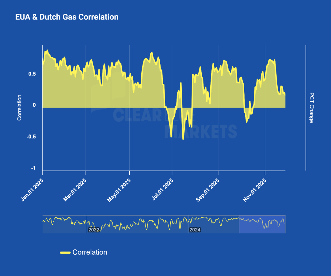 圖3:歐盟碳配額當(dāng)年12月期貨合約與歐洲TTF天然氣近月合約之間的14日相關(guān)系數(shù)(ClearBlue Markets, ICE交易所)