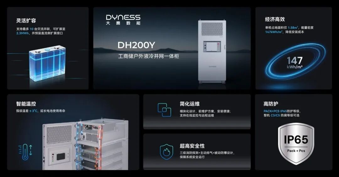 本項(xiàng)目所采用的大秦?cái)?shù)能DH200Y液冷一體機(jī),其單柜容量高達(dá)232kWh,支持最多 10 機(jī)交流并聯(lián),可擴(kuò)展至 2.3MWh,能夠適配不同規(guī)模的用電需求。該產(chǎn)品具有設(shè)計(jì)緊湊、占地面積小的特點(diǎn),能量密度達(dá)147kWh/㎡,能夠?yàn)榭蛻粲行Ч?jié)約用地空間。在安全層面,DH200Y 搭載了 Pack 級(jí)電芯監(jiān)測、三級(jí)消防探測以及主動(dòng)排氣和被動(dòng)防爆設(shè)計(jì),通過全方位防護(hù)設(shè)計(jì)確保設(shè)備長期安全穩(wěn)定運(yùn)行。該產(chǎn)品廣泛適用于辦公園區(qū)、商業(yè)樓、充電站等多種并網(wǎng)場景,是企業(yè)構(gòu)建高效、可靠智慧能源體系的理想選擇。
