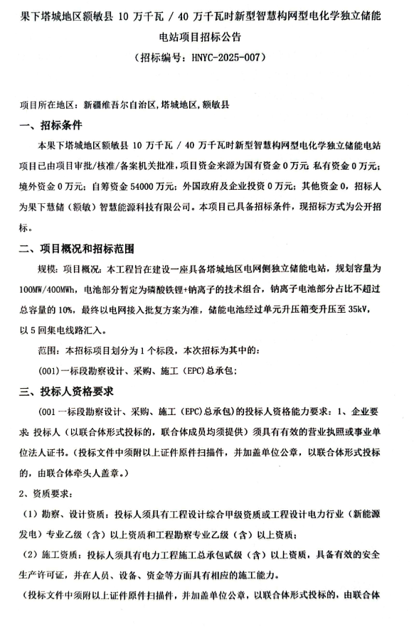 中國(guó)儲(chǔ)能網(wǎng)訊:12月3日,果下塔城地區(qū)額敏縣10萬千瓦/40萬千瓦時(shí)新型智慧構(gòu)網(wǎng)型電化學(xué)獨(dú)立儲(chǔ)能電站項(xiàng)目招標(biāo)公告發(fā)布。項(xiàng)目招標(biāo)人為果下科技旗下的果下慧儲(chǔ)(額敏)智慧能源科技有限公司,本工程新疆塔城地區(qū)建設(shè)一座電網(wǎng)側(cè)獨(dú)立儲(chǔ)能電站,規(guī)劃容量為100MW/400MWh,電池部分暫定為磷酸鐵鋰+鈉離子的技術(shù)組合,鈉離子電池部分占比不超過總?cè)萘康?10%,最終以電網(wǎng)接入批復(fù)方案為準(zhǔn),儲(chǔ)能電池經(jīng)過單元升壓箱變升壓至35kV,以5回集電線路匯入。本次招標(biāo)需求為EPC總承包。
