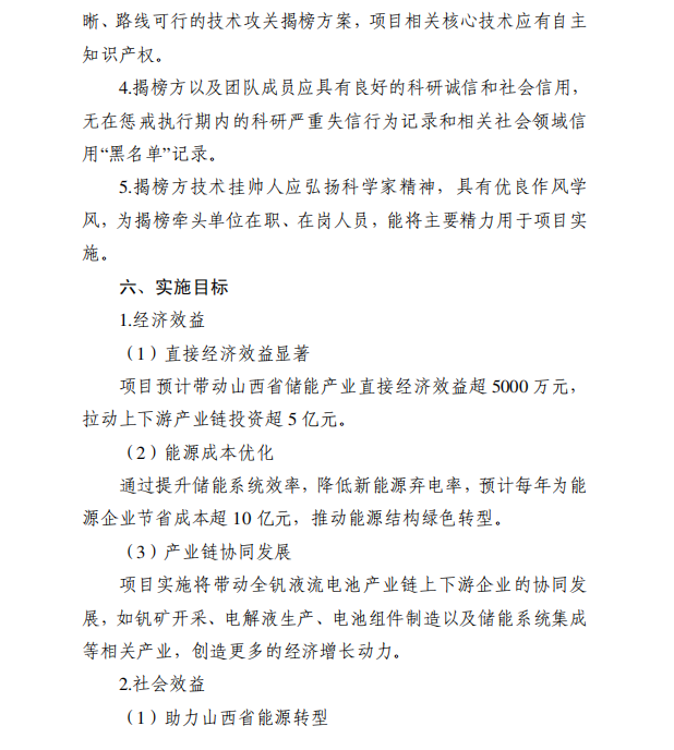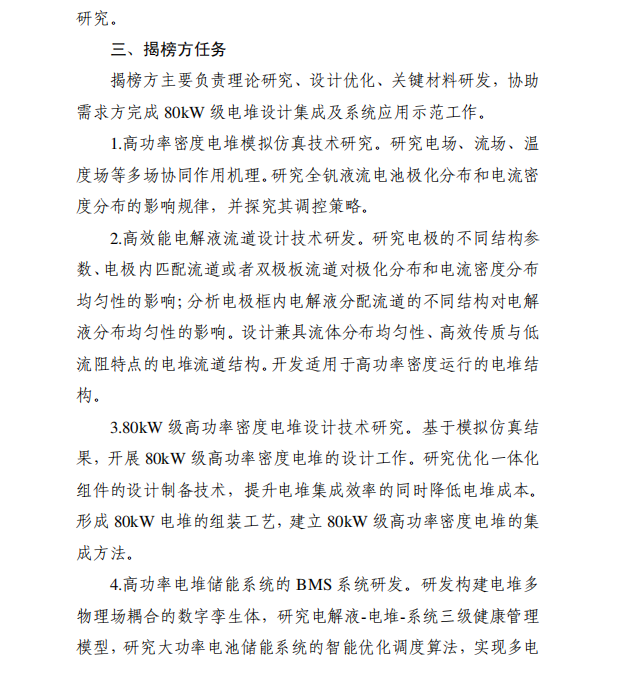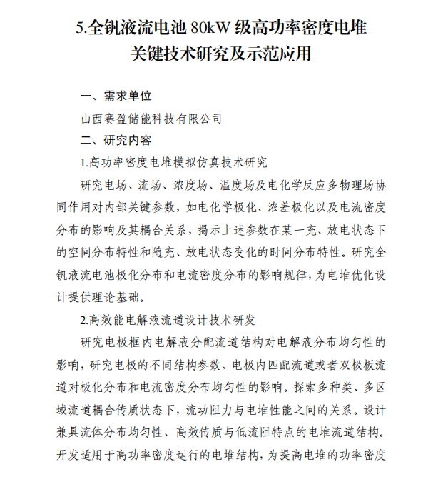 此前,7月16日,山西省科學(xué)技術(shù)廳曾發(fā)布《關(guān)于2025年度山西省科技重大專項(xiàng)計(jì)劃“揭榜掛帥”項(xiàng)目(第一批)張榜的通知》,此次張榜項(xiàng)目共14項(xiàng)。其中包含1個(gè)液流項(xiàng)目,全釩液流電池80kW級(jí)高功率密度電堆關(guān)鍵技術(shù)研究及示范應(yīng)用,需求單位為山西賽盈儲(chǔ)能科技有限公司。